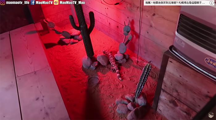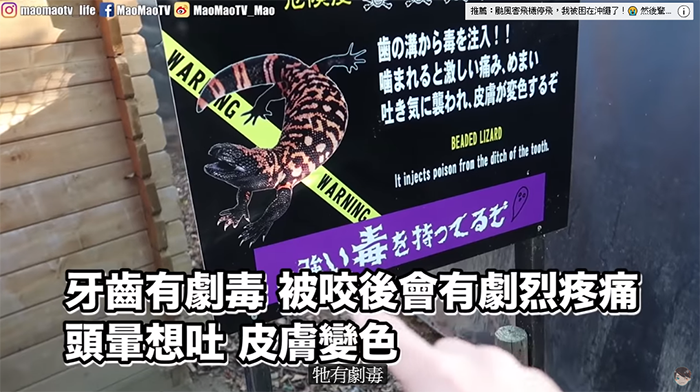 之後Mao也大膽進入毒蜥蜴的房間裡,她更念出蜥蜴的介紹:「牙齒有劇毒,被咬之後會有劇烈疼痛,頭暈想吐,皮膚變色」,攝影師一聽也表示他不想進去,讓Mao相當著急,不過後來兩人還是勇敢踏入,也在一睹蜥蜴本尊風采之後便迅速出來。