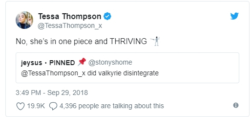 ▼原來有漫威粉絲在推特上向泰莎湯普森詢問:「女武神也灰飛煙滅了嗎?」沒想到泰莎湯普森直接大方回答:「不!她完好無缺且健壯。」那這位女性超級英雄角色,是否會在明年即將上映的續集《復仇者聯盟 4》登場呢?
