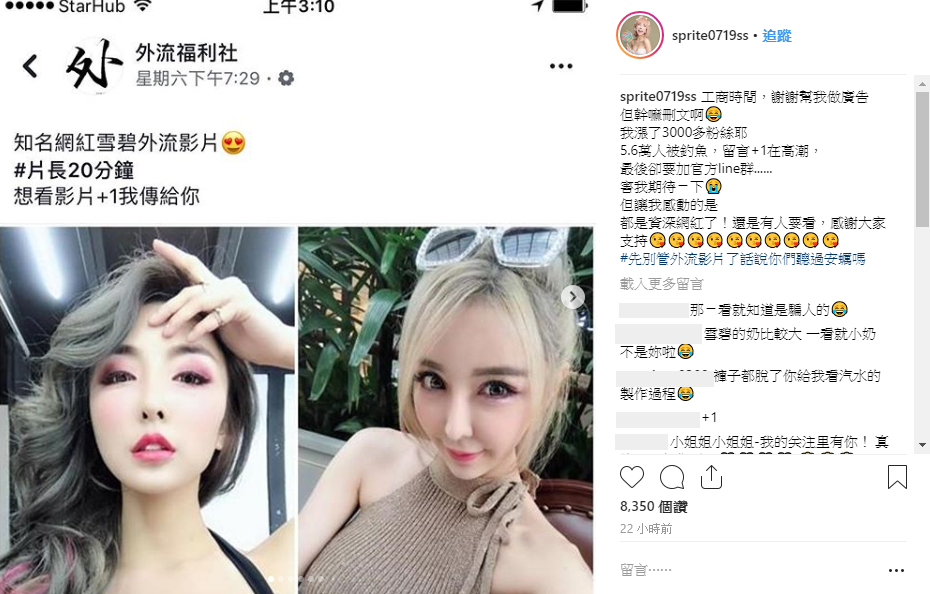 貼文下方也有許多網友力挺本本,表示:「完全不可能相信」、「想也知道是假的」、「根本不像= =」,而先前性感網紅「雪碧」也遭遇相同手法受害,本人更親自進入社團留言喊「+1快發啦,我也想看」,霸氣手法惹得網友誇讚,雪碧因此還漲粉。不過此外流影片是詐騙手段,透過雪碧實測與本本的補充,也再次提醒眾網友,需要多加注意,不要受騙了。