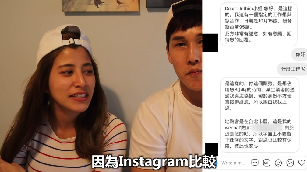 28日Jeff & Inthira上傳新影片,影片中Jeff表示Inthira過去便常常接收到許多包養邀約,從馬幣八千到人民幣兩萬多皆有,相當誇張。而近日他們決定拍片講出來,便是因為Inthira又收到來自台灣董事長的邀約,更開出台幣95萬的天價,讓兩人相當傻眼,而他們也在鏡頭前和對方切洽的人直接對談,更爆出諸多內幕!