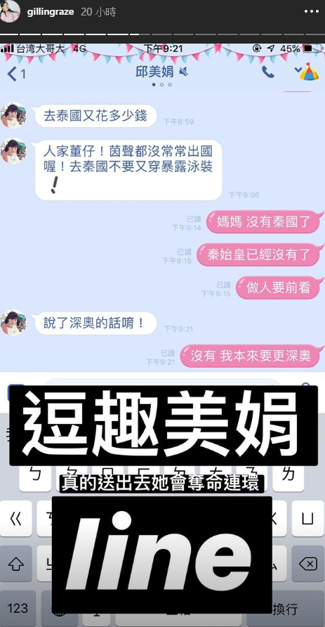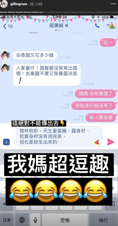 3日她在IG限時動態中放上自己與媽媽的對話,只見媽媽詢問「去泰國又花多少錢」、「人家董仔、茵聲都沒常常出國喔,去泰國不要又穿暴露泳裝」,而也因為媽媽不小心將「泰國」打成「秦國」,也讓木星搞笑回覆:「媽媽,沒有秦國了,秦始皇已經沒有了,做人要前看」。不過後來她也打上:「我林牧昕,天生愛耍騷、露身材,就算身材沒有很完美,但也是你生出來的...」,調皮diss媽媽。