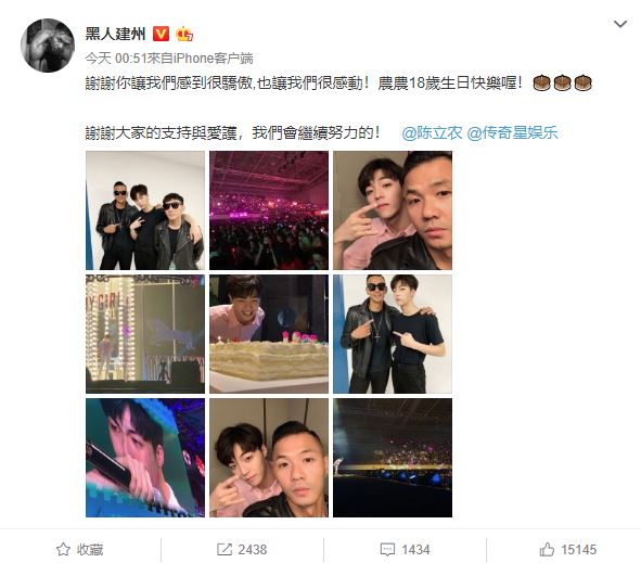 生日會過後,黑人陳建州也分享了側拍影片,除了感謝粉絲到場支持,也特別稱讚陳立農配文到,「謝謝你讓我們感到很驕傲,也讓我們很感動!農農18歲生日快樂」!
