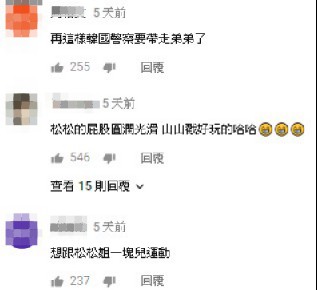 影片結束後,網友也紛紛留下評論,例如:「再這樣韓國警察要帶走弟弟了。」、「松松的屁股圓潤光滑,山山戳好玩的哈哈。」、「想跟松松姐一塊兒運動。」