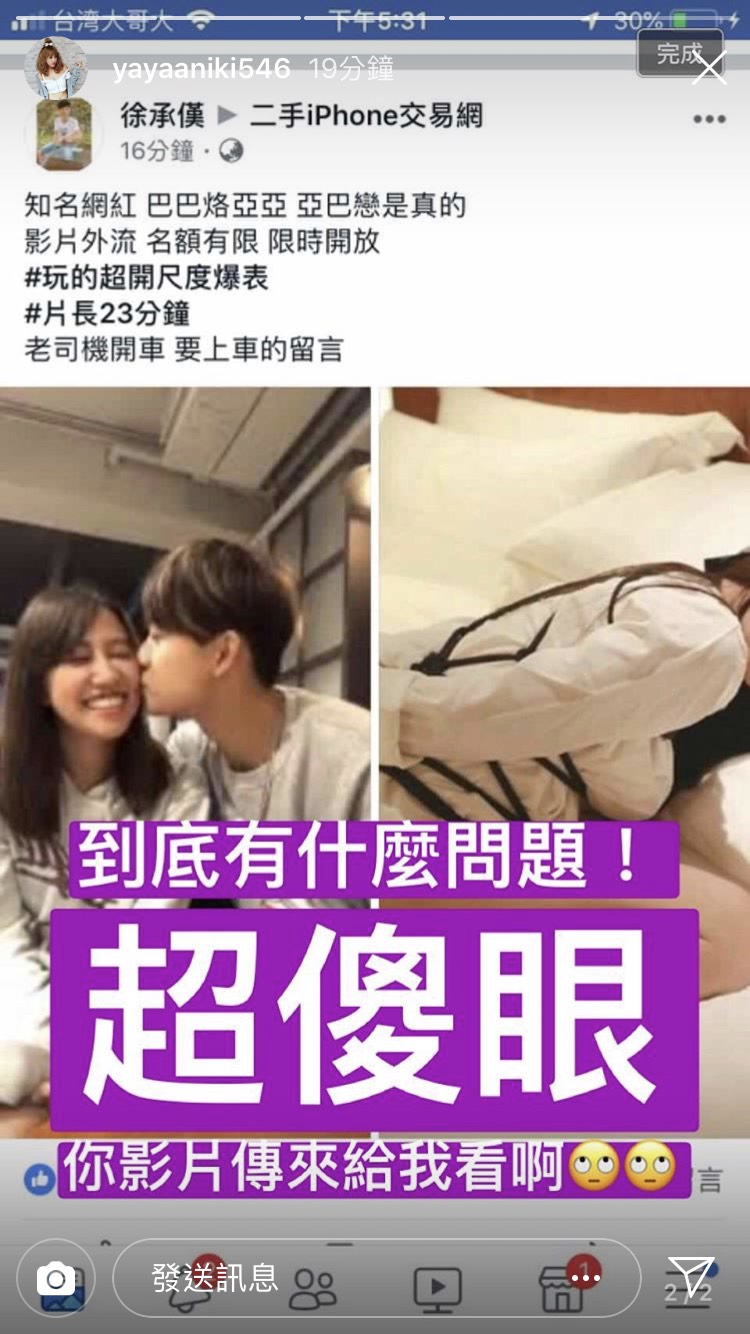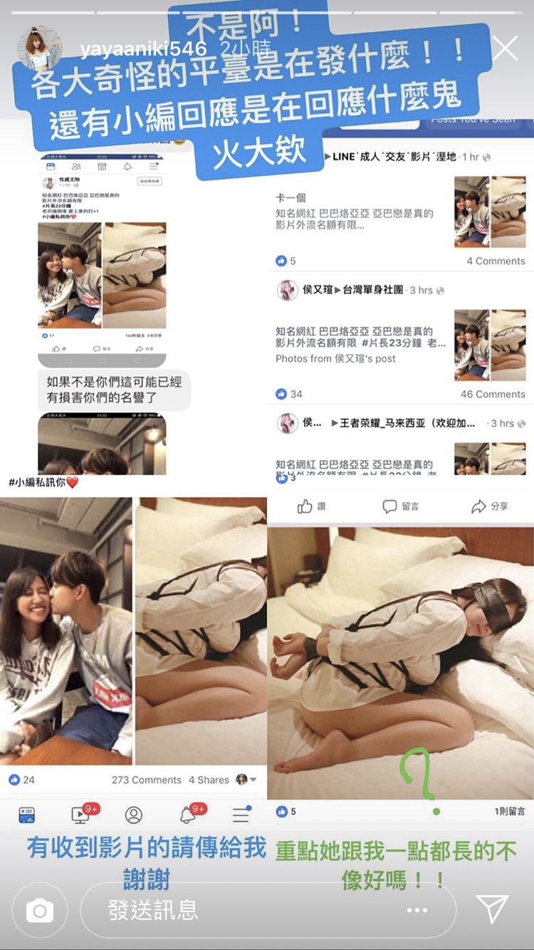 亞亞在自己的IG限時動態上,發佈兩則動態,第一則附上截圖並火大表示:「到底有什麼問題!超傻眼,你影片傳來給我看啊!」,還疑似氣不過又發了一篇:「不是啊!各大奇怪的平台是在發什麼!!還有小編回應是在回應什麼鬼,火大唉」可見此事讓亞亞非常受不了。而照片中可以看到除了亞亞和巴巴烙的合照之外,還有某位女生僅穿襯衫的綑綁煽情照,但照片中女子根本不是亞亞,相當誇張。