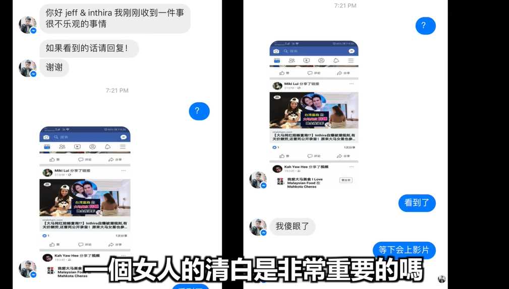 怎料影片發布之後,兩人卻被媒體惡意中傷,甚至讓Jeff&Inthira的生活嚴重受到影響,使得他們不得不再度拍攝影片回應!只見影片中Jeff針對大馬媒體「Viralcham」、「88razi」的報導生氣表示「有嚴重的誤導性」,原來Inthira原本只是出於善意將上流社會潛規則曝光,卻被寫成「大馬網紅陪睡富商?!Inthira自爆被潛規則,有天價酬勞,還冒死公開錄音」,更放上一張Inthira背部全裸的照片,誤導許多觀眾!