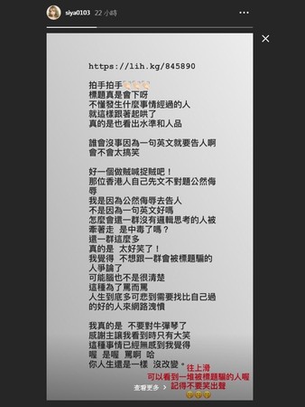 近日,陳斯亞看完偶像「少女時代成員」蒂芬妮(Tiffany Young)的演唱會後,在IG上PO出感性心得,下方英文的部分卻被網友指出有文法錯誤,在網路上引發激烈筆戰,其中,更有網友直接口出惡言罵她有精神病,言詞相當激烈,事後,陳斯亞也因自身遭到網友公然侮辱,決定提告,並在不久後PO出自己到警局報案的三聯單,指出「每個人都該為自己的留言負責」!
