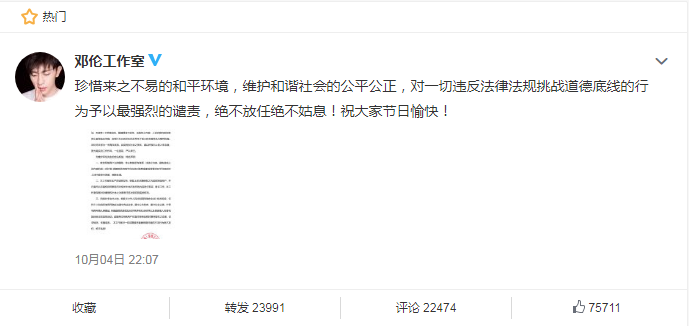 針對網路上惡意攻擊行為,鄧倫工作室發表聲明,表示近日有網友持續發布、散播具有不實性、詆毀性之內容,對鄧倫帶來了極大的名譽危機與精神損害。工作室嚴重譴責發布、轉載上述涉嫌侵權之內容的網絡用戶,並稱已委托北京星權律師事務所對相關主題發布的內容進行取證、備訴工作。