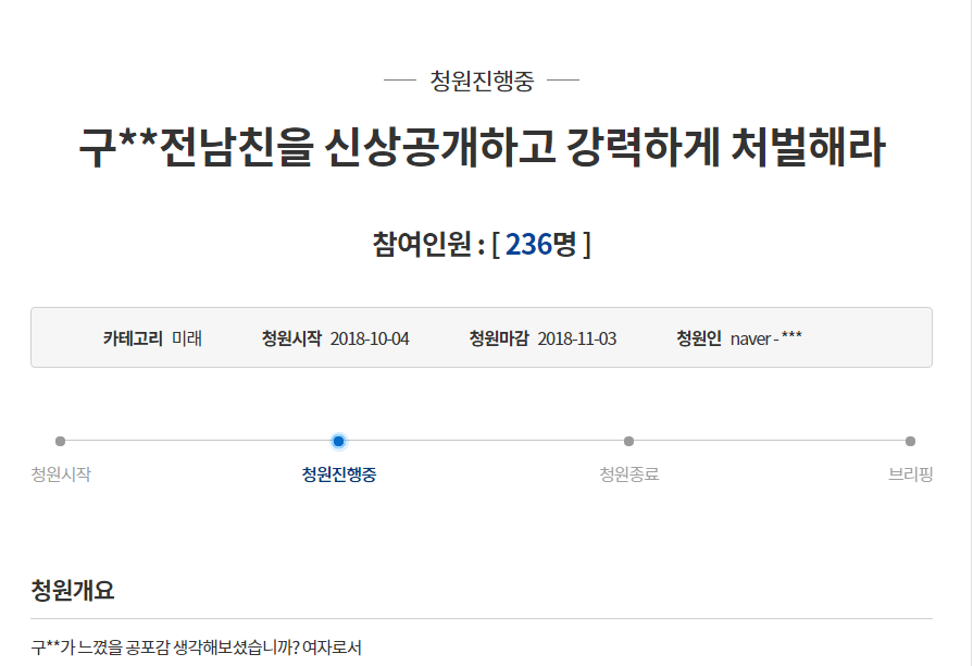 事情持續延燒,南韓「青瓦台請願網站」上有超過20萬民眾要求嚴懲前男友崔鐘範,青瓦台請願網站是南韓總統文在寅上台後推行的政策之一,給予南韓基層民眾擁有直接向政府請運的管道,只要請願的內容在「30天內獲得20萬人以上」的支持,政府相關單位就會對此做出回應。