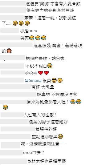 只見照片上傳之後,許多網友紛紛留言:「這還要“夠胸”才會有大乳暈欸」、「因為那個陰影嗎?」、「身材太好也是種困擾」、「很有魅力的光影身材曲線」、「奈奈!這麼一說,我都臉紅了」、「那是oreo」、「調皮的影子」、「樹葉的影子這麼剛好」、「所以每一個按下快門的時刻都很重要」、「oreo口味?」。