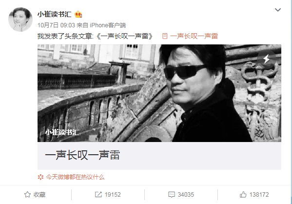 名嘴崔永元是前央視當家主持人,先前因不滿馮小剛導演之前拍攝之電影《手機》使他形象受到因此,如今又新開拍的電影《手機2》,故發布了幾張合約照片,爆出參與演出《手機2》的范冰冰曾簽署之「陰陽合同」,事情才因此爆開。如今,事情告一段落,崔永元卻在7日時於他的小號微博發布「一聲長歎一聲雷」一文,全文如下:
