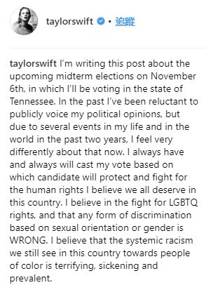 泰勒絲的Instagram擁有1.12億的追蹤者,7日,她首度打開政治話題,並公開透露,她向來以人權,包括性別和種族權益作為她的投票依據。此次,泰勒絲明確力挺民主黨,並說到會回到她的家鄉田納西州投票,更明確指出,共和黨同時也是川普總統支持者的布萊克本,忽視多元族群的種種政策。