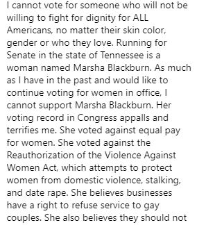 泰勒絲於文中指出,雖然布萊克本是位女性,不過她的總總作法卻可能讓弱勢族群再度被外界剝奪。針對女權,布萊克本反對女性同工同酬,並在『反婦女暴力再授權』法案投下反對票,泰勒絲認為「這個法案是核保護婦女免於遭受家暴、攻擊以及約會強暴等。」接著,再指出布萊克本輕視同性文化,包括反對同性婚姻合法化,以及企業可拒絕服務同性伴侶。