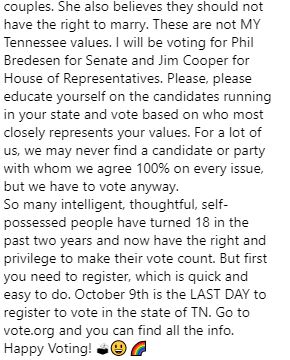 泰勒絲也在文末明確表達她的理念,並說到「這些都不是田納西州的價值。參議員部份我將投票給布雷德森(Phil Bredesen),眾議員則是投給庫柏(Jim Cooper)。」最後,她呼籲自己的歌迷能以選票支持正確價值觀,並懇求到「拜託,請教育你們州的候選人,並投票給最能代表你們價值的人」。