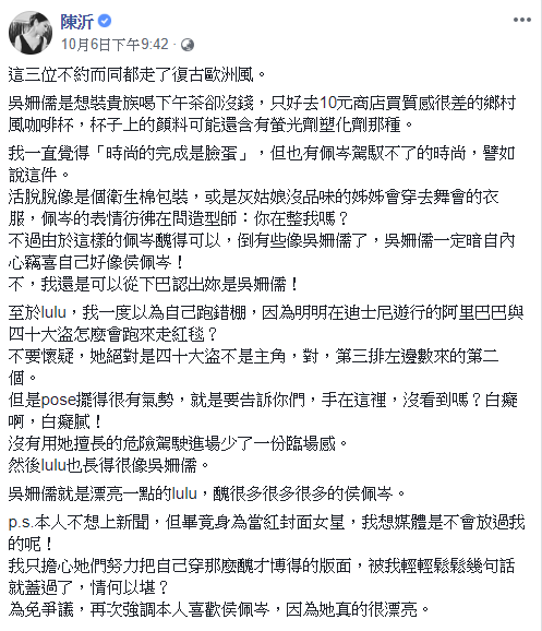最後,陳沂分析3人的紅毯穿搭,「吳姍儒就是漂亮一點的lulu,醜很多很多很多的侯佩岑。」笑虧:「我只擔心她們努力把自己穿那麼醜才博得的版面,被我輕輕鬆鬆幾句話就蓋過了,情何以堪?」