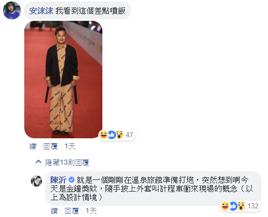 網友們看了笑翻,也紛紛貼出其他藝人的紅毯穿搭,陳沂笑說,KID一身土色寬鬆套裝,「就是一個剛剛在溫泉旅館準備打炮,突然想到啊今天是金鐘獎欸,隨手披上外套叫計程車衝來現場的概念」。不過她大大稱讚謝忻的銀白色低胸禮服,甚至稱她是「紅毯五美」,「看事業線這麼深就知道事業正旺!」