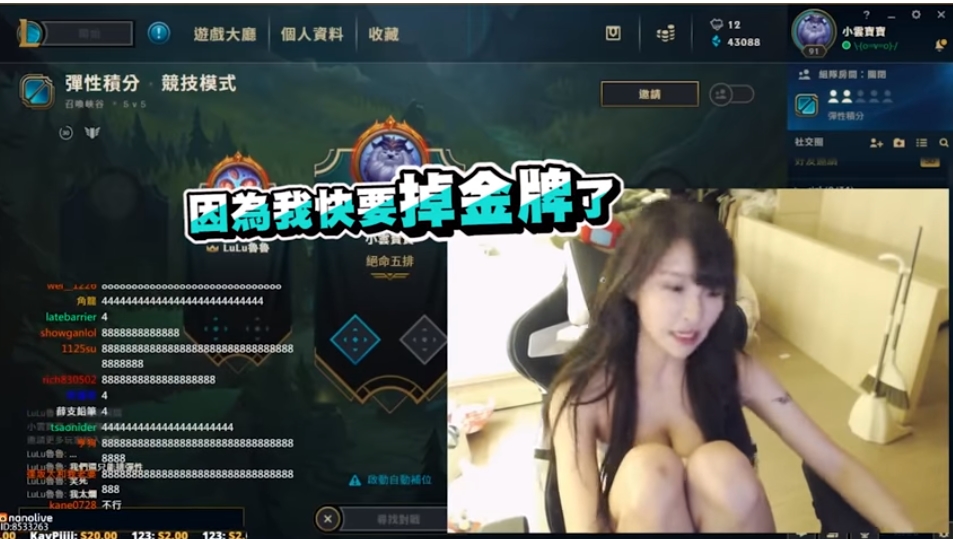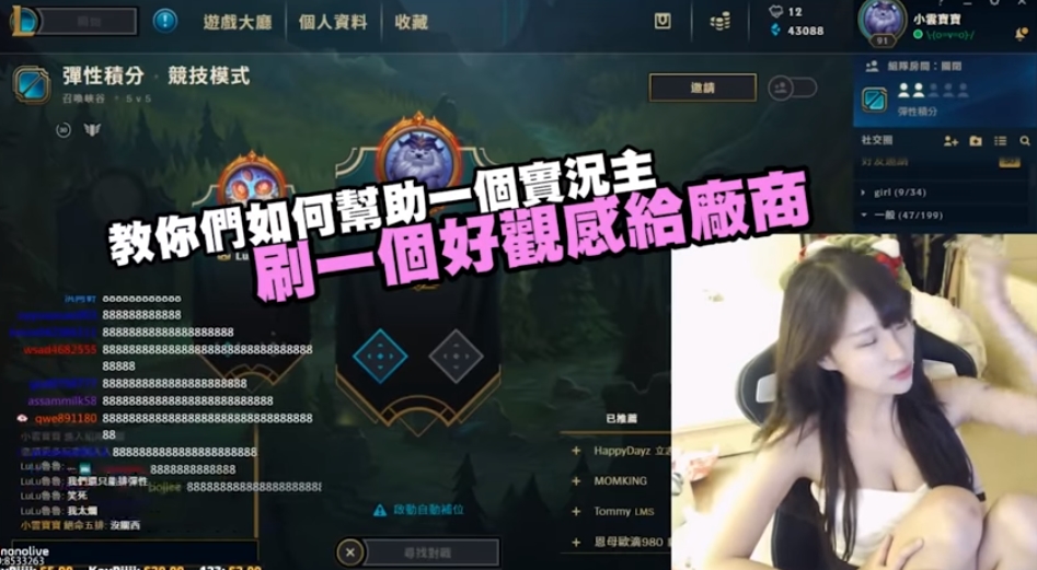 近日,小雲寶寶上傳新影片,只見她一開頭就怒喊「給一點點面子,就給我一點點面子好不好」,接著她就表示,現在心情不是很好,因為她的英雄聯盟金牌牌位快要掉了,直指「你們還要這樣刺激我」。之後她便進一步說明「每次工商,廠商面前(你們)就在那邊8888888」,喊話網友「你們有本事就不要停,真的是受不了你們」,質問「你們有想過我的感受嗎?」最後更是直接指出「他日你的孩子也會這樣對你們」。