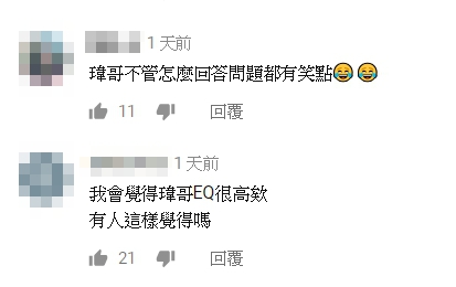 看來這次瑋哥還是沒有上當並且也說了許多令人笑瘋的回應,粉絲也在影片下方的留言稱讚瑋哥,例如:「覺得瑋哥各種神答的按讚~」、「瑋哥不管怎麼回答問題都有笑點」、「我會覺得瑋哥EQ很高,有人這樣覺得嗎?」