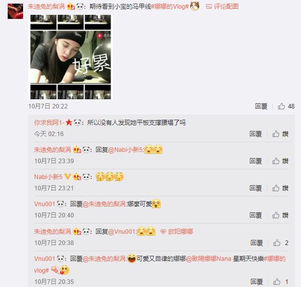 粉絲將歐陽娜娜的6個腹肌運動合成一張圖,並回應「期待娜娜的馬甲線」,也有人佩服她相當自律。不過,卻有眼尖的網友發現,歐陽娜娜作平板支撐時姿勢錯誤,便留言到「所以沒有人發現她平板支撐腰塌了嗎」。