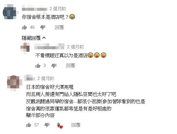 看完這部影片有許多網友都非常羨慕Mao住過的學生宿舍,有人說:「你宿舍根本是酒店吧?」也有人贊同說:「不看標題還真以為是酒店」,還有人說:「日本的宿舍好漂亮喔,而且兩人房還有們給人隱私空間也太好了吧!反觀我聽過同學的宿舍....都很小很擠(參加營隊看到的也是,宿舍真的很靠運氣都希望室友是好相處的。」