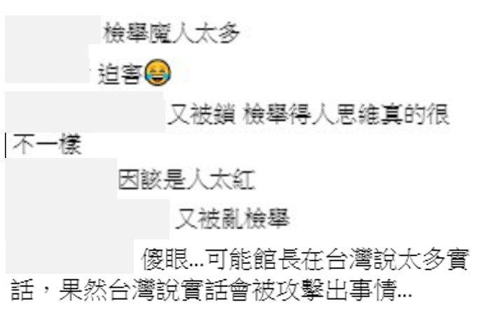 館長氣得直接寄信給FB申訴卻無法處理,館長怒而飆罵:「王X蛋,以為這樣子擋得了我嗎!」、「如果台灣有辦公室我現在馬上過去,操X媽我一定翻桌子」。奇怪的是,粉絲團其他管理員是可以進行發文與回覆的,唯獨館長本人帳號是被封鎖的。此事也不禁讓人聯想是否是綠營支持者進行惡意檢舉,館長也怒批檢舉者:「我真的打從心裡面詛咒你們這些人全部都落選」,最後他也再度重播在直播裡的話:「國民黨民進黨就是垃圾,我現在只是從裡面挑一個不爛的,一樣,陳其邁可以來,我問得有偏袒嗎?」,表示自己根本沒有特定的政治立場。
