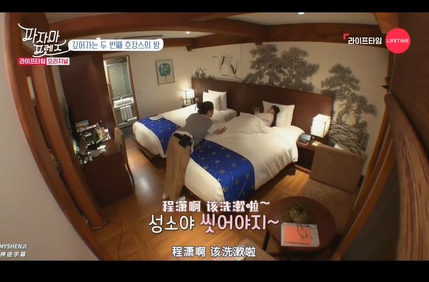 最新一集中,經過一天遊戲體力不支的程瀟一回飯店房間就睡著,宋智孝和張允珠看見還沒梳洗倒頭就睡的程瀟,分別上前試圖叫醒她。回房間的宋智孝先被埋在棉被裡的程瀟嚇到,爾後叫醒程瀟並說到「先去洗澡卸妝吧」,不過程瀟卻回絕「等你洗好再叫我」宋智孝不氣餒到她床邊搔癢程瀟並說「這樣你就起不來了」。