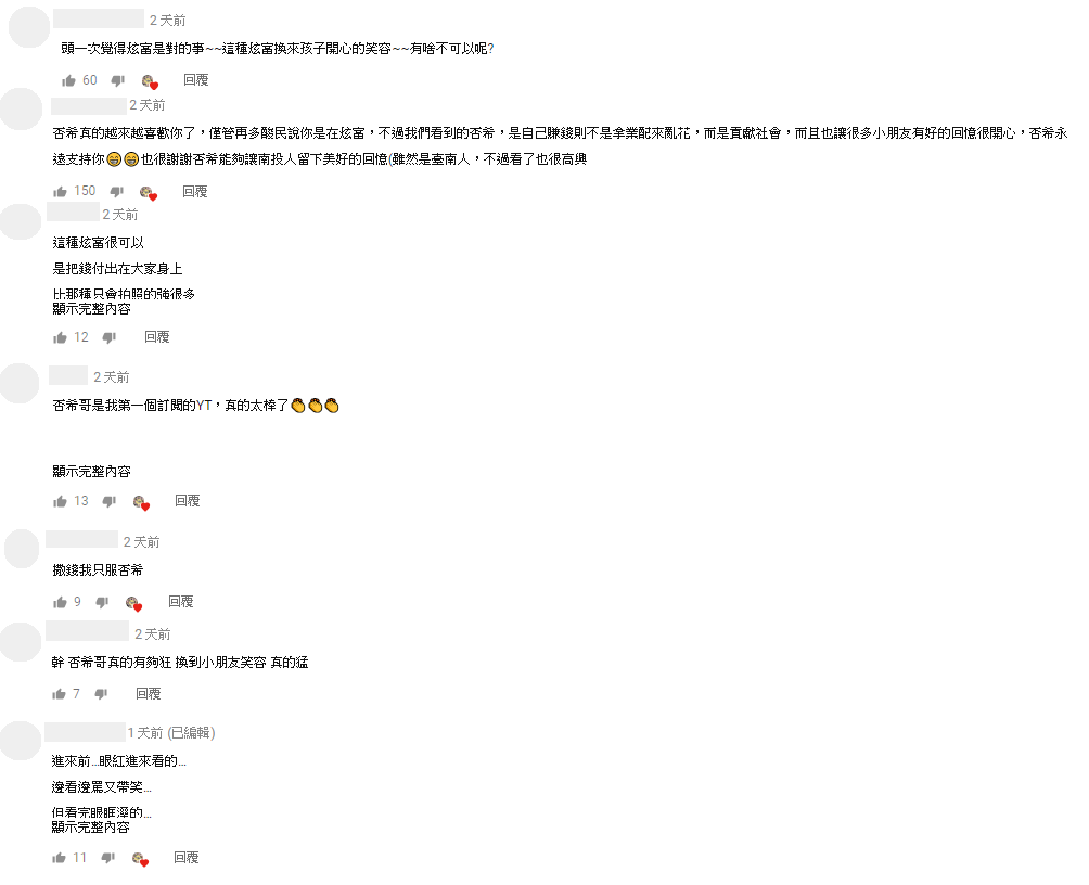 影片播出之後,許多網友紛紛留言:「第一次看到有錢又囂張到這種程度,但是卻讓人感到很貼心感動」、「頭一次覺得炫富是對的事~~這種炫富換來孩子開心的笑容~~有啥不可以呢」、「特地留言,謝謝您的付出,不是炫富、什麼的,或許有人會覺得反感,但為什麼不正向的看待呢?」、「這種炫富很可以 是把錢付出在大家身上 比那種只會拍照的強很多」。