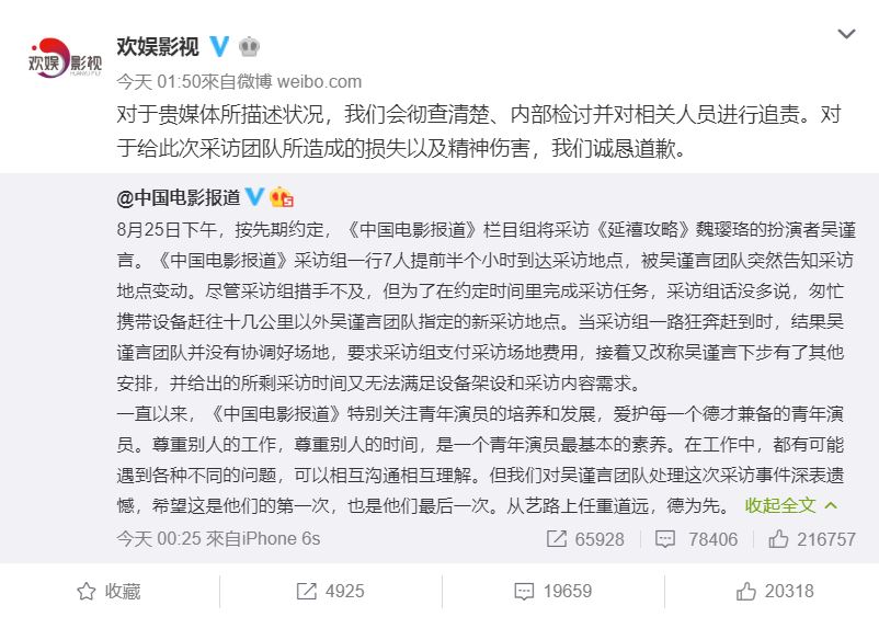 8月底,吳謹言接受央視節目《中國電影報導》採訪,卻被節目組在微博爆料,吳謹言團隊人員囂張行徑,像是臨時更改場地、要求節目組支付場地費等。為此,吳謹言本人和公司也出面認錯並道歉,當時外傳此事延燒到廣電局上頭,通知各大公司必須「慎用」這個演員,讓吳謹言原先的兩個戲約都飛了,近兩個月原先以平息的耍大牌風波如今又再度掀起爭議。
