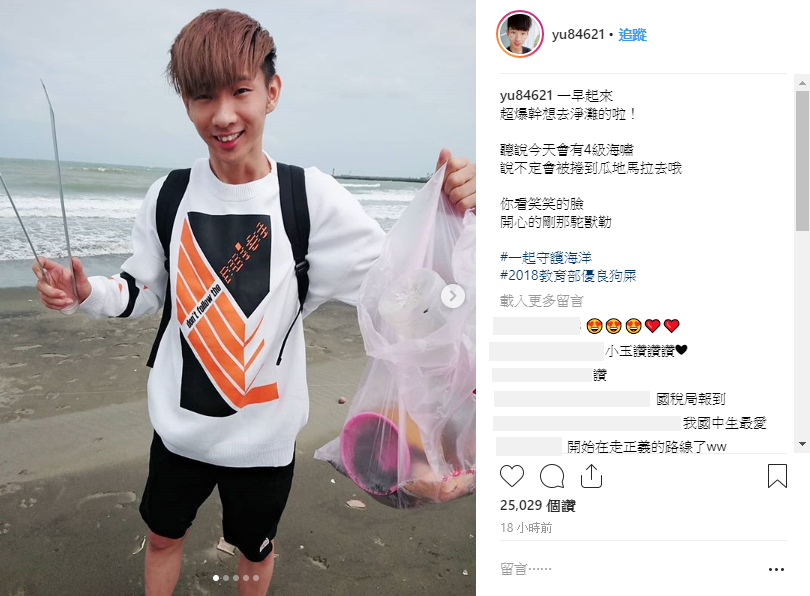 小玉昨在IG中發布淨灘的照片,更表示:「一早起來超爆幹想去淨灘的啦!聽說今天會有4級海嘯,說不定會被捲到瓜地馬拉去哦」,只見照片中的他穿著大學T和短褲,相當休閒,而拍片夥伴笑笑也一同加入淨灘行列,兩人最終共撿了好幾袋的垃圾,為環保付出心力。