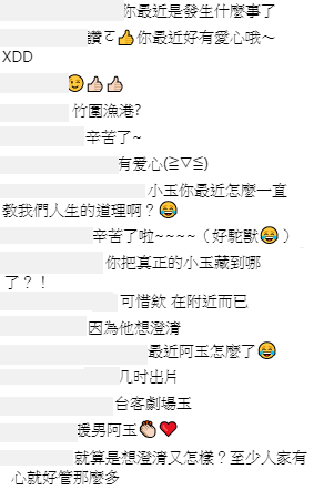 貼文發布之後,許多網友紛紛留言:「你最近是發生什麼事了」、「最近太有愛心了吧」、「你把真正的小玉藏到哪了?!」、「辛苦了啦」、「最近很不一樣」、「因為他想澄清」、「最近整個大愛」、「台客劇場玉」、「突然那麼有教育意義 嚇到我了」、「才嘴台客自己又去淨灘」。
