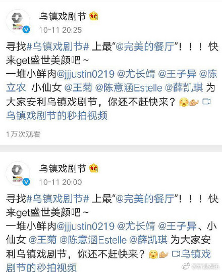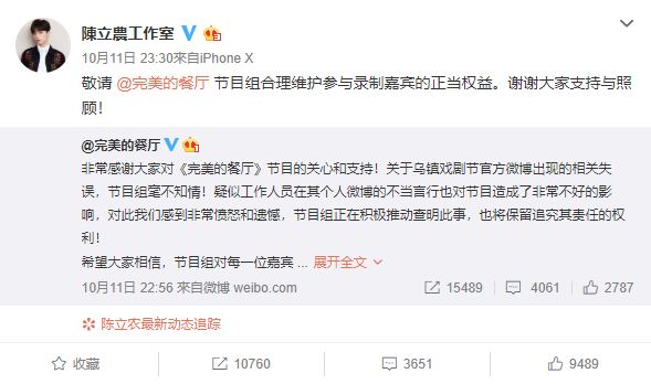 11日,「烏鎮戲劇節」官方微博邀請《完美的餐廳》宣傳戲劇節,文中也標記節目藝人包括Justin、王子異、尤長靖,但卻獨漏陳立農。隨後,戲劇節官網馬上下架貼文,並重新標記陳立農。