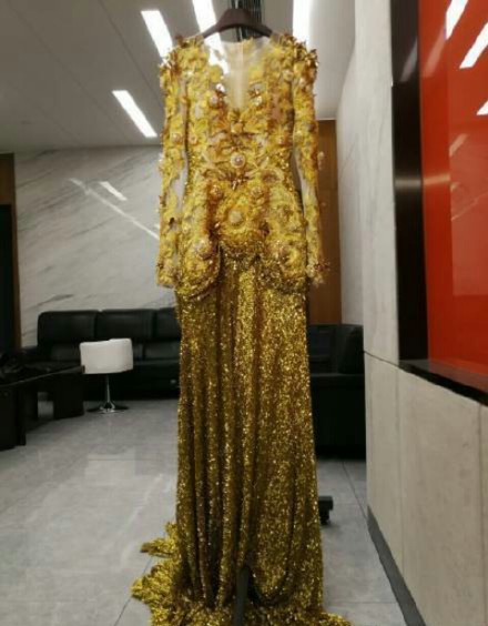 早在11日,金鷹女神戰袍就已經曝光,承襲傳統金色基調,此次禮服透過刺繡技術,看起來又更為精緻,上半身繡滿黃花,花蕊則綴有亮片,而胸前深V設計僅縫上一層薄紗,下半身布滿金色亮片,垂墜感十足,迪麗熱巴還沒穿上禮服就已經有大批粉絲敲碗期待了。