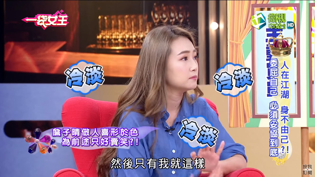 丫頭近日受邀上《一代女王》分享自己身不由己的經驗,丫頭說,她17歲進入演藝圈,當時她對於喜歡、不喜歡都全寫在臉上,不懂得隱藏,也因此吃了不少虧。某次她在錄《我愛黑澀會》時,節目找來一個她討厭的來賓,不懂事的她,竟當場擺出臭臉、不耐煩的模樣,就連拍手歡呼也力不從心,完完全全表現出「就是不喜歡那個人」。