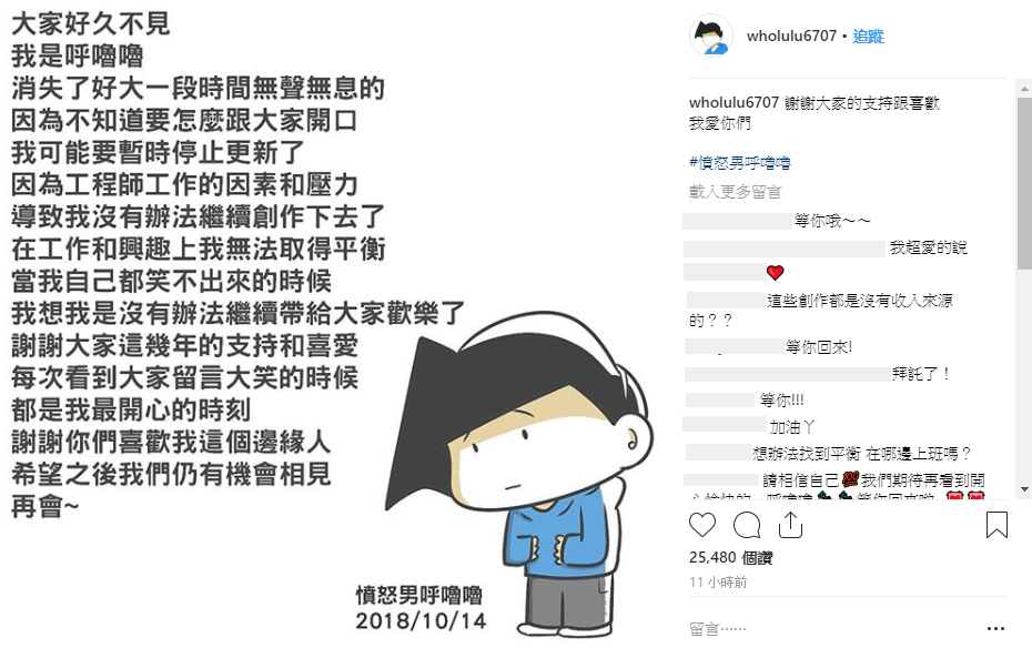 呼嚕嚕昨天無預警在IG中宣布「消失了大一段時間無聲無息的,因為不知道要怎麼跟大家開口,我可能要暫時停止更新了」,呼嚕嚕表示因為本身的工程師工作的因素和壓力,讓他沒辦法繼續創作下去,「在工作和興趣上我無法取得平衡,當我自己都笑不出來的時候,我想我是沒有辦法繼續帶給大家歡樂了」,投下震撼彈。