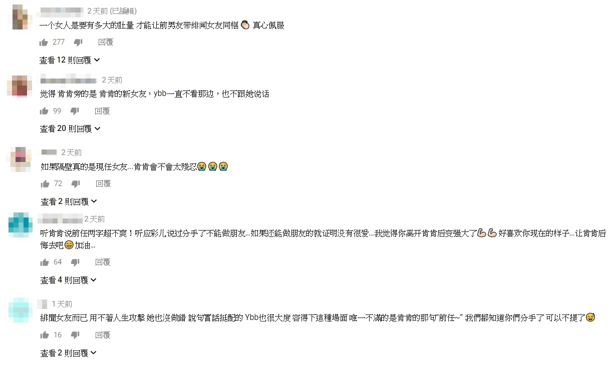 影片結束後,就有許多心疼楊寶貝的網友們,紛紛留言評論,有網友說:「一個女人是要有多大的肚量,才能讓前男友帶緋聞女友同框,真心佩服」、「覺得肯肯旁邊的是新女友,YBB一直不看那邊,也不跟她說話」、「如果隔壁真的是現任女友...肯肯會不會太殘忍」、也有人鼓勵楊寶貝:「聽肯肯說前任超不爽,我覺得你離開肯肯變更強大了,好喜歡你現在的樣子...讓肯肯後悔去吧!加油!」、「說句實話挺配的,YBB也很大度,容得下這種場面,唯一不滿的是肯肯的那句"前任~"我們都知道你們分手了,可以不提了」。