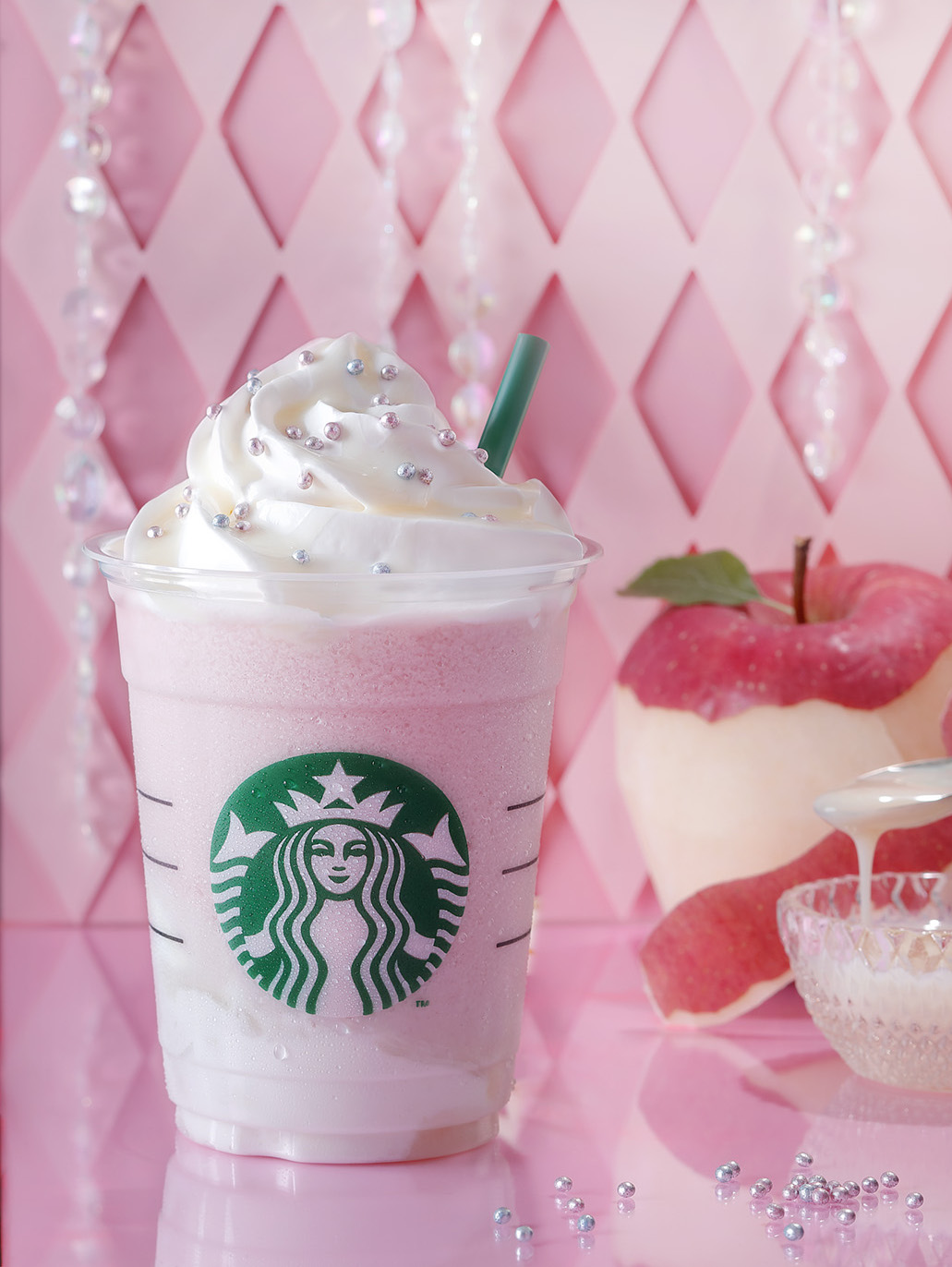 另一款則是公主星冰樂。顏色粉嫩,看起來就像公主的天真無邪,裡面添加了蘋果蜜餞、白色摩卡將、鮮奶油和牛奶,上頭還撒上了粉色跟藍色的珍珠糖,就像是公主搖曳的裙擺一樣亮眼。