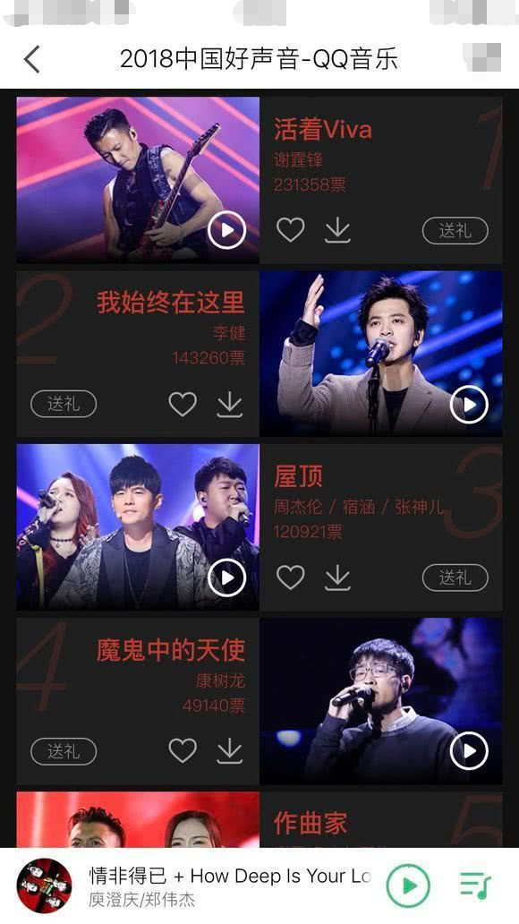 該網友翻出康樹龍上周表演在「QQ音樂平台」的排行榜,發現位居第4的康樹龍票數和其他選手差距甚大,從排行榜中顯示,對比謝霆鋒和周杰倫戰隊超越10萬票數,康樹龍僅得到4萬多票。