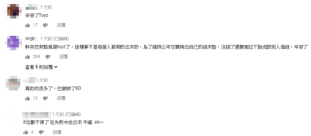 最後在因緣際會下,椅子剛好回香港參加「電競音樂節」和英皇的人認識、接線,展開合作,才讓椅子能夠重生,回想過去椅子也覺得自己透過這件事改變了很多,影片下方,也有許多網友回覆:「辛苦了Toyz」、「突然有點佩服Toyz了,這種事不是每個人都做出來的,為了維持公司甘願掏出自己的錢來墊,沒錢了還願意拉下臉皮跟別人借錢,辛苦了」、「真的改很多了,也變帥了XD」、「8位數不得了,從失敗中走出來,牛逼,skr~」