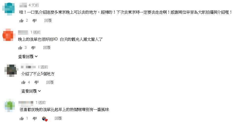 影片一出爐,就令許多網友大肆讚賞,例如:「哇!一口氣介紹這麼多東京晚上可以去的地方,超棒的!下次去東京時一定要去走走啊!感謝兩位辛苦為大家拍攝與介紹喔!」、「晚上的淺草也很好拍XD 白天的觀光人潮太驚人了」、「很喜歡夜晚的淺草比起早上的熱鬧喧嘩別有一番風味」、更有人打趣地說:「介紹了不止5個地方」