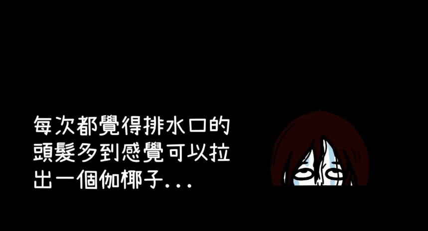 但沒想到最後啾啾妹話峰一轉地說「所以說頭髮很可怕,我不敢拿」讓老公卡爾相當傻眼的表示「蛤,這是你的頭髮耶」,但她依舊大喊「我不要~~好可怕阿!!」老公卡爾便白眼的回應「不拿就不拿掰什麼故事」原來一切都是啾啾妹自己編的故事。而啾啾妹也在結尾時補充說道「每次都覺的排水口的頭髮多到感覺可以拉出一個伽椰子(貞子)」。
