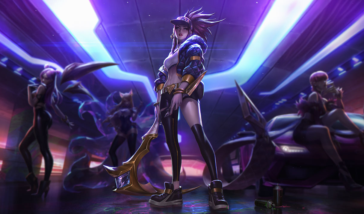 從圖片中可以看到女子團體 K/DA 由凱莎、阿璃、依芙琳及阿卡莉組成,以時下熱門的 Kpop 為主題製作系列角色造型。這四個造型擁有系列感的新技能特效及音效,在外型上也相當具有一致性,每個造型都至少存在一個施放技能時會播放的音樂,而在玩家按下回家按鍵時,四個角色會像 Kpop 團體一樣跳出一模一樣的排舞(如下方影片所示),甚至還有聚光燈照下,忠實呈現 Kpop 團體在舞台上表演的情況,然而在新造型中只有 Riot 親女兒凱莎推出金色版的的至臻造型。