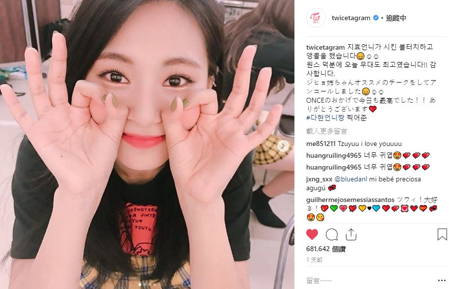 14日,周子瑜在TWICE官方Instagram中分享後台賣萌照,並以韓文表示感謝日本粉絲的熱情應援,文中也說明團員志效在周子瑜的臉頰畫了腮紅,另一成員多賢則為她拍下賣萌照片。