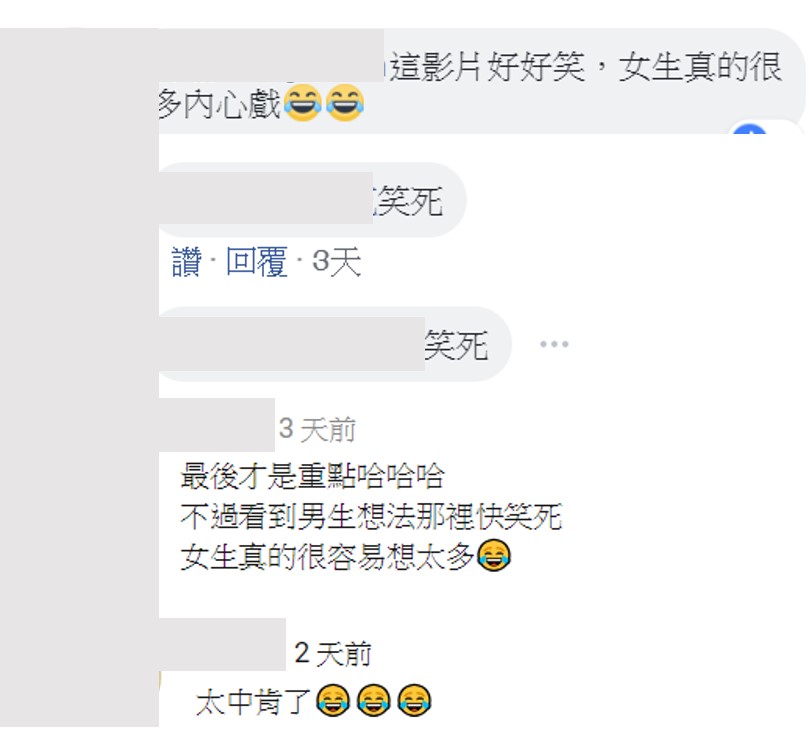 然而,男生真的這麼想嗎?小李接著演繹男生當時的真正想法,原來把手抽走其實是嘴巴吃到了眼睫毛想拍掉,回答簡短時其實是在思考出門的東西都帶齊全了沒,揉眼睛也只是因為打了哈欠想把眼淚擦掉而已,如此反差的思考模式讓網友紛紛留言:「看到男生想法那裡快笑死,女生真的很容易想太多」、「太中肯了」、「這影片好好笑,女生真的很多內心戲」、「笑死」