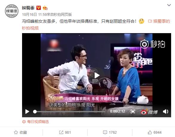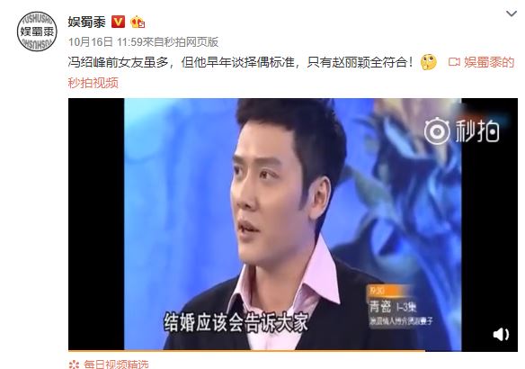 大陸演員趙麗穎和馮紹峰經歷多次度假、懷孕傳言,16日,正值31歲的趙麗穎終於在生日當天於微博上「官宣」兩人結婚事實。其中馮紹峰因為先前曾多次假戲真做而傳出不少緋聞,甚至有陸媒譏諷歷任對象彷彿「宣傳期女友」,這次和趙麗穎走入婚姻,就有微博網友翻出馮紹峰過去在節目中公開的擇偶條件,和趙麗穎似乎完全吻合。