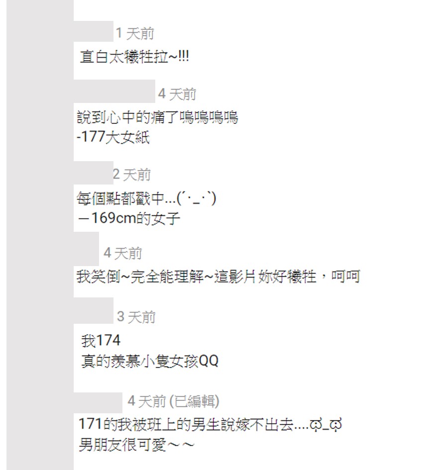 諸如此類的生活困擾,如此貼切的煩惱以及超直白不計較形象的演出,讓許多網友感同身受,在下方紛紛留言表示:「我笑倒~完全能理解~這影片妳好犧牲」、「每個點都戳中」、「說到心中的痛了嗚嗚嗚嗚」、「我174,真的羨慕小隻女孩QQ」、「171的我被班上的男生說嫁不出去」、「直白太犧牲拉」