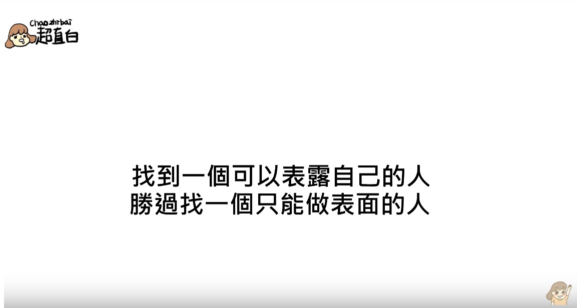 影片的最後超直白表示:「找到一個可以表露自己的人,勝過找一個只能做表面的人」,並說到現在的社會有些男生為了要滿足自己的自尊心,無法接受女生比男生高,都會希望女生要矮一點,太高的女生反而會自卑,但是她認為最重要的是:「如果一個人真正喜歡你的話, 是不會去在意你的身高和長相」