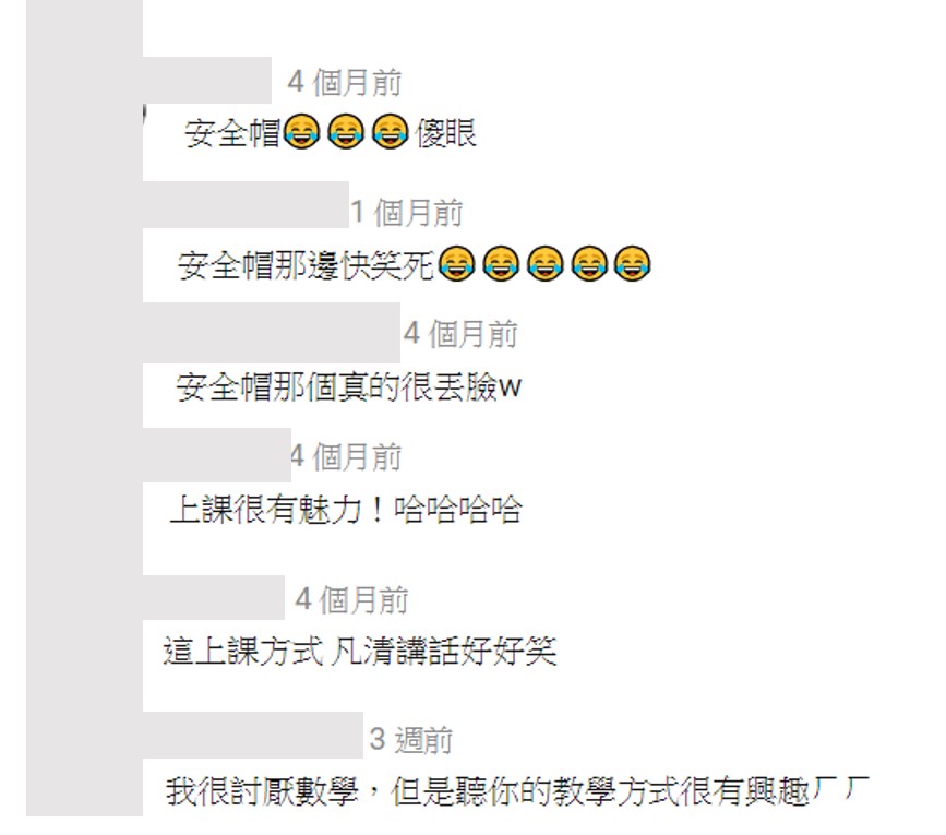 凡清幽默搞笑的教學方式讓網友也紛紛留言表示:「安全帽那邊快笑死」、「安全帽那個真的很丟臉」、「上課很有魅力!」、「這上課方式,凡清講話好好笑」、「我很討厭數學,但是聽你的教學方式很有興趣」