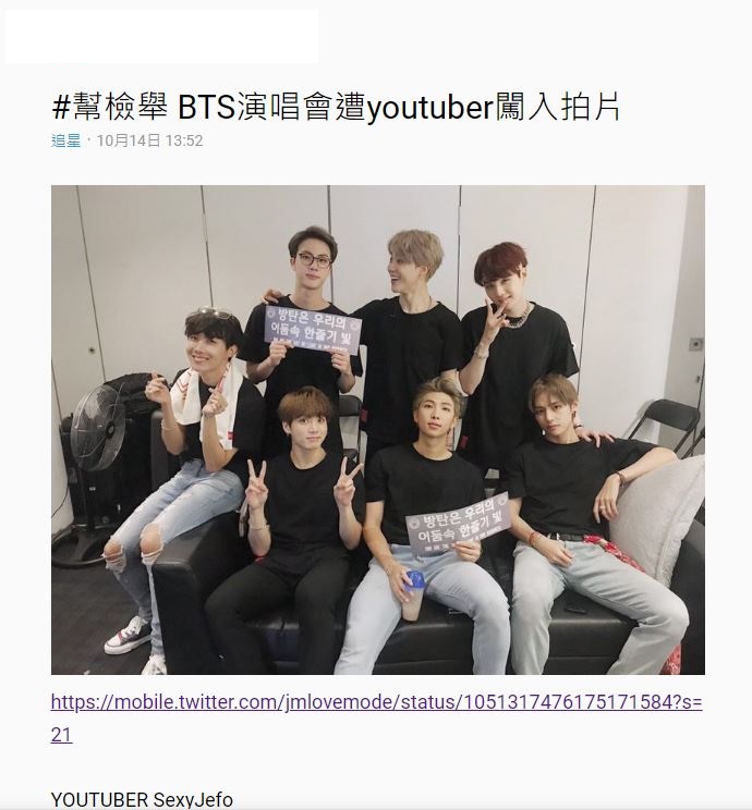 14日在台灣論壇「Dcard」中,網友以「幫檢舉BTS演唱會遭youtuber闖入拍片」為題,公開韓國網紅闖進防彈少年彩排現場偷拍惡行,希望透過網友聯合檢舉,成功抵制該頻道。
