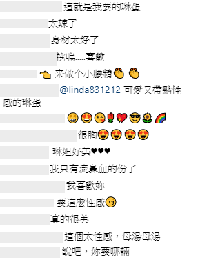 許多網友紛紛留言:「有點厲害」、「受不了了啦」、「你好漂亮」、「琳妲超漂亮」、「琳蛋好正」、「這表情也太可愛囉」、「很火辣哦。哈哈」、「說吧,妳要哪輛」、「你這樣子我們會受不了哈哈」、「這樣真的不行啦」、「完美乳溝」。