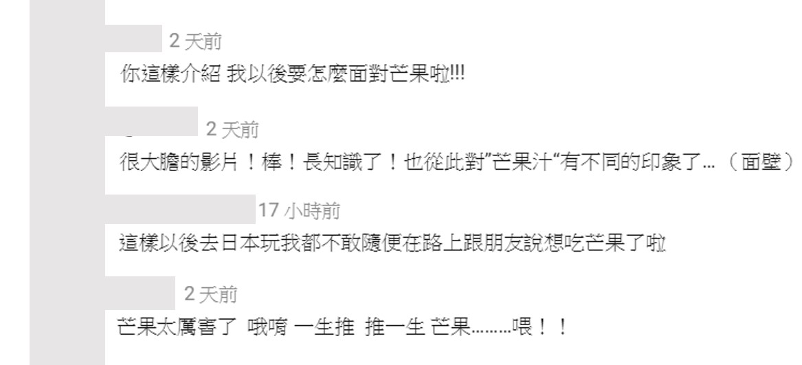 接下來Ryu和Yuma要講到生殖器官的講法,不管男生和女生都可以通稱為「Asoko」用中文翻譯的話就是「下面」的意思,較為隱晦的用法,若是要用直接口語一些的用詞,女生的私密處被稱為「Manko」念起來和中文的「芒果」發音很相同,此用法是較為粗魯的用法Yuma表示平時也不太會用此講法。聽到此講法後網友紛紛在下方留言:「你這樣介紹,我以後要怎麼面對芒果啦!」、「這樣以後去日本玩,我都不敢隨便在路上跟朋友說想吃芒果了啦!」、「芒果太厲害了」、「很大膽的影片,棒!也從此對芒果汁有不同的印象了」