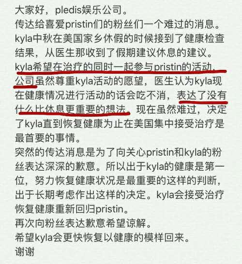 而Kyla經紀公司是在去年10月宣布, Kyla因健康問題暫時靜養一陣子,但如今,事隔一年,完全沒有 Kyla的消息,且Kyla的親妹妹也曾在社群網站上透露,Kyla已經沒有想當偶像的念頭了,讓粉絲們不禁紛紛猜想Kyla是否真的不會回歸了?近日,就有粉絲發布了一張自己在美國遊樂園拍的照片,影片中的工作人員疑似就是混血的Kyla,但無法確認是否為本人。無論如何,相信只要Kyla過得開心,粉絲們也就會放心了。